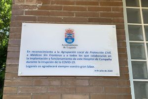 La placa conmemorativa ha sido situada en el Pabellón Carlos Sastre, donde se instaló el Hospital de Campaña El Ayuntamiento de Leganés ha celebrado un...