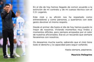 El hasta ahora entrenador del CD Leganés, Mauricio Pellegrino, se ha despedido con un escrito de cuatro párrafos en el que ratifica el “común acuerdo a...